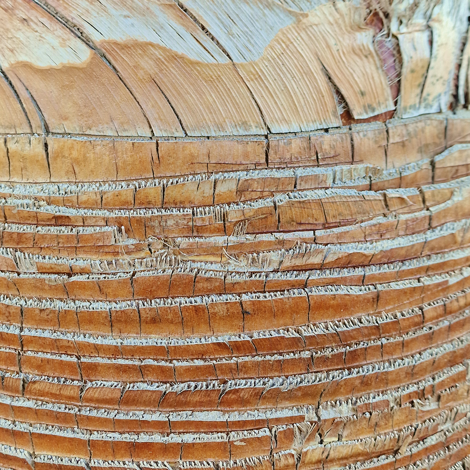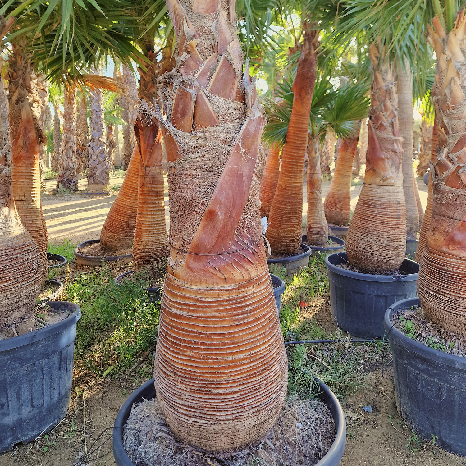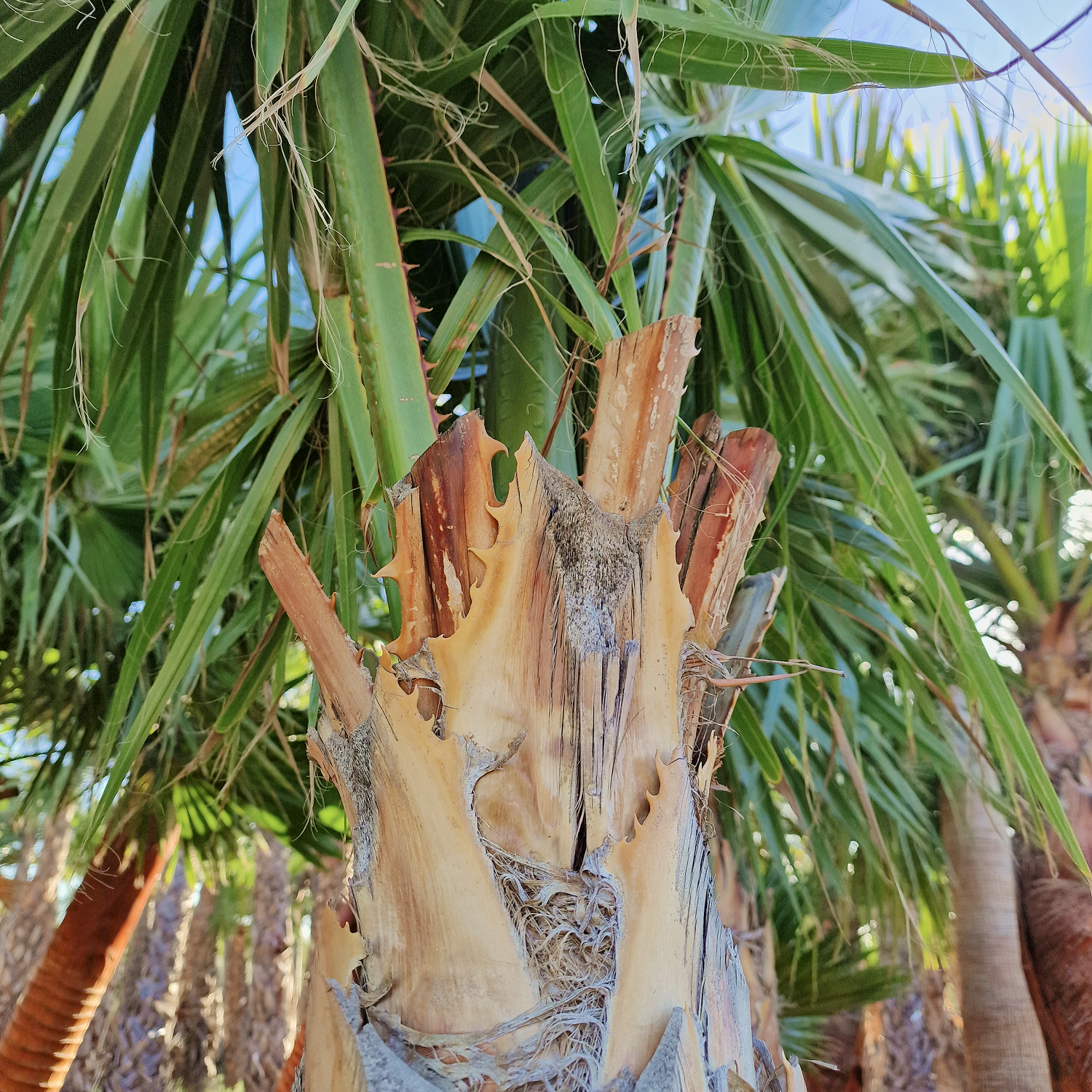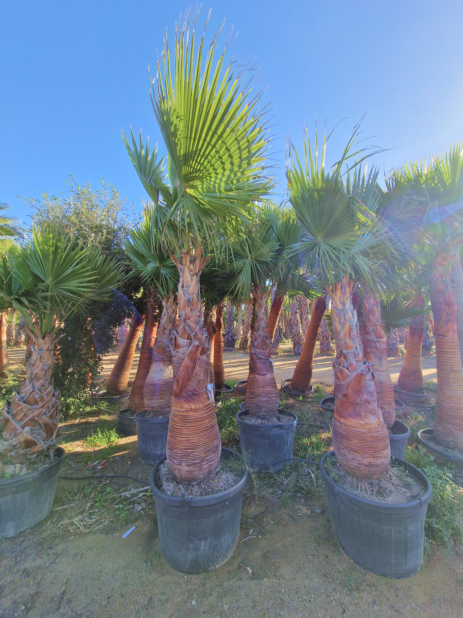 La particularité de ce washingtonia nettoyé réside dans son tronc soigneusement dégagé : les anciennes palmes ont été retirées pour laisser apparaître un stipe régulier et élégant. Son port léger et vertical, combiné à des palmes larges et lumineuses, crée un effet visuel dynamique et très décoratif.