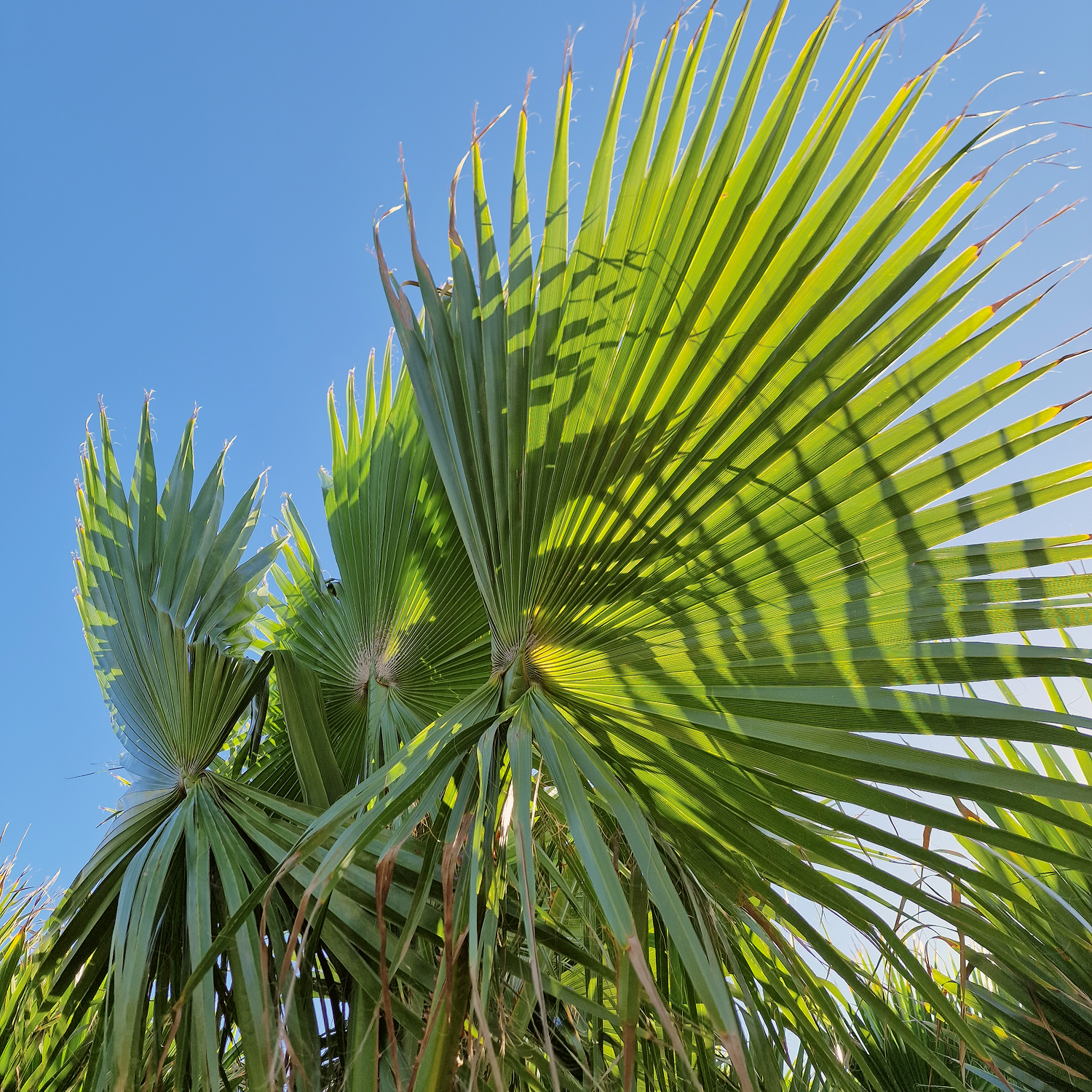 - Feuillage : grandes palmes vert clair en éventail
