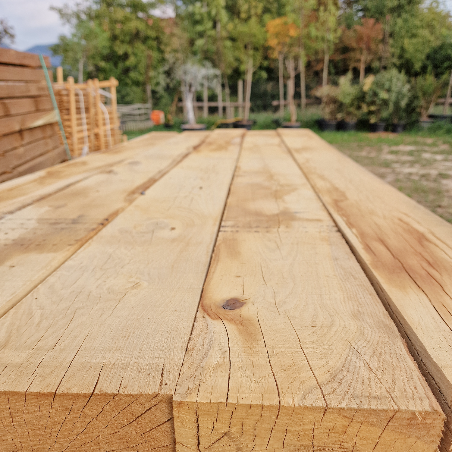 Le chêne est un bois naturel : il peut présenter des variations de forme, de teinte ou des fissures en fonction de son exposition extérieure. Cela n’altère pas son usage ni son charme, mais fait partie de l’authenticité des traverses paysagères naturelles.